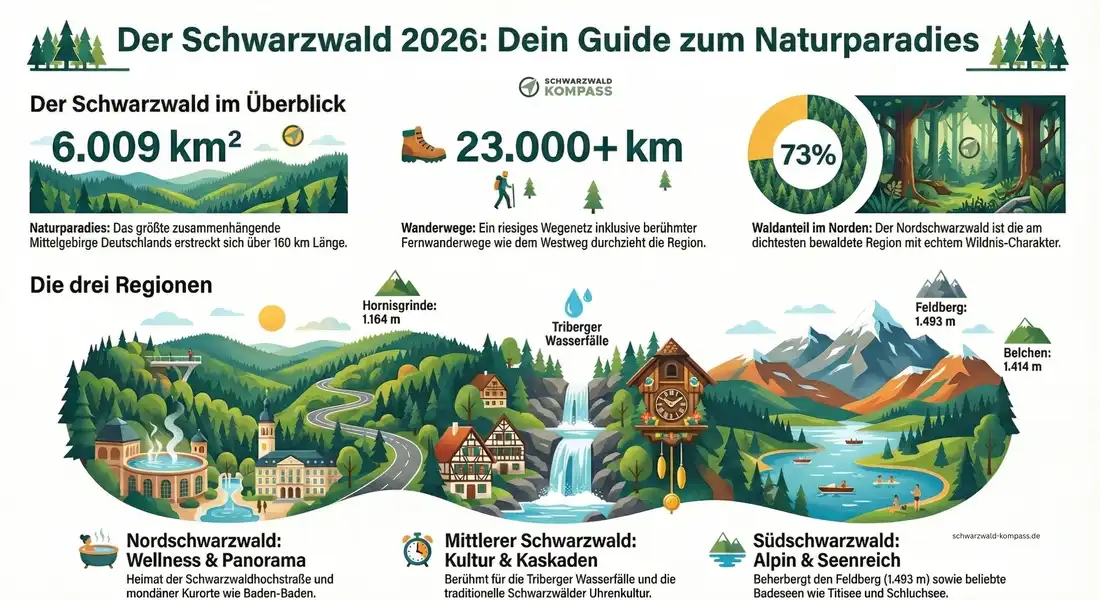 Er gliedert sich in drei Regionen: den Nordschwarzwald rund um Baden-Baden und die Schwarzwaldhochstraße, den Mittleren Schwarzwald mit dem Kinzigtal und den Südschwarzwald mit Freiburg, Titisee und Feldberg. Jede Region hat ihren eigenen Charakter, und genau das macht den Schwarzwald so vielseitig.